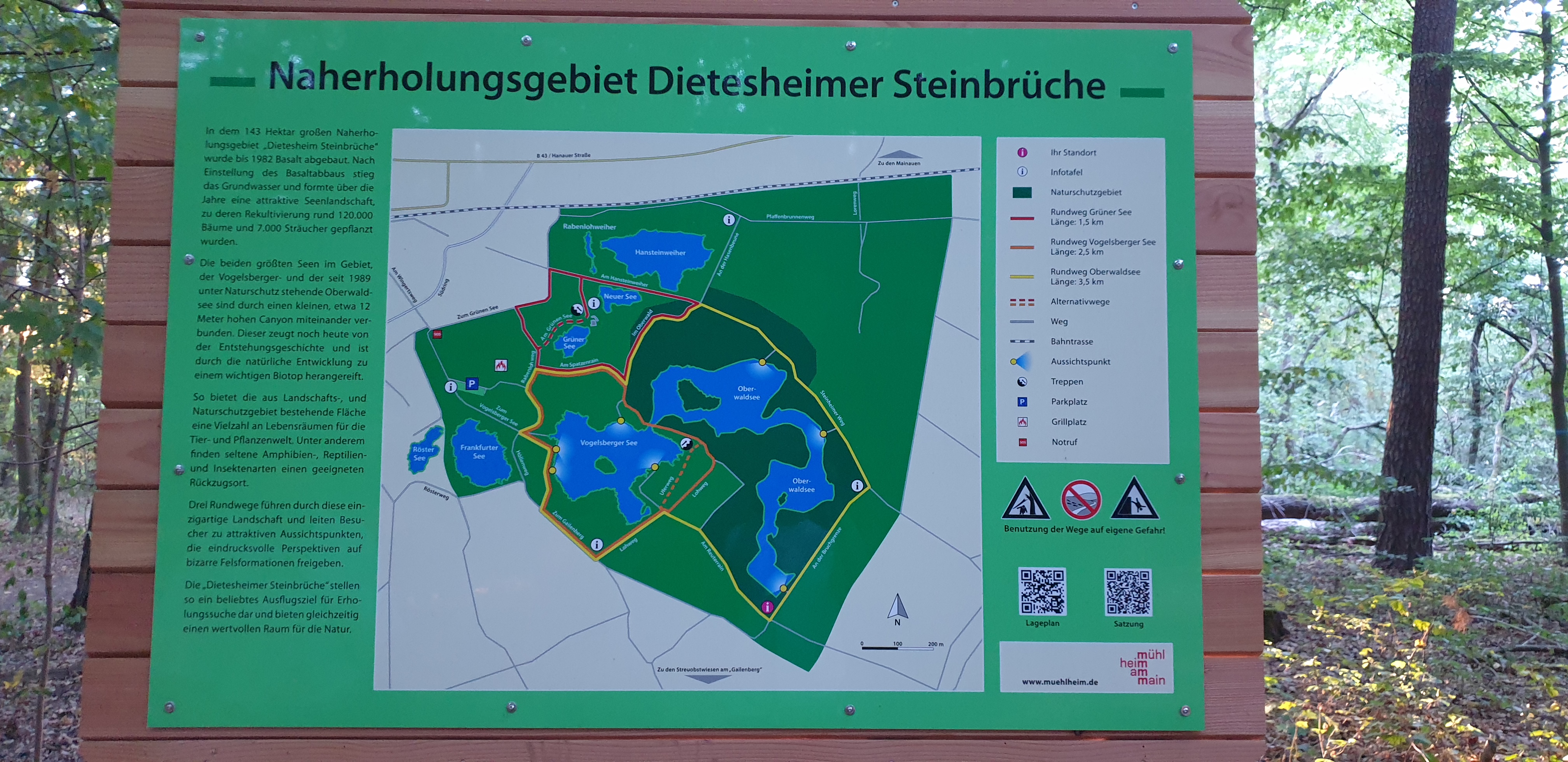 Mit allen Fotostopps und Aaaah's und Ooooh's ob der schönen Ausblicke, sowie einer Runde Stretching waren wir ca 1h 15 Min. unterwegs (ca 4,5 km) und haben sogar einen See umrundet. Wem das zu viel ist, der kann auch nach einer der ersten Aussichtsplattformen den Rückweg antreten und hat so nur den halben Weg (Rondo bis zum Rand des Naherholungsgebiet (weißer I-Punkt auf der Detailkarte) ca 700 m - s.Maßstab - konnte leider keinen Wegpunkt markieren) Der Wald beginnt bereits am 4.blauen Punkt.